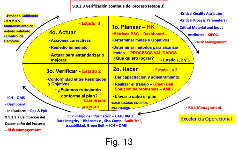 Así mismo, aplicando el concepto de Lean Validation en un proceso de mejora continua (PDCA), y con base en este modelo, mi propuesta es que tenemos en la fase del Plan el equivalente al protocolo de validación, definiendo e identificando por cada operación unitaria, entre otros, los CMA, CPP, CCP y CQA´s, el SIPOC, los medibles a cuantificar para el éxito del proceso de validación, con un enfoque en Gestión de Riesgos de la Calidad (GRC), en la etapa del hacerla capacitación a detalle del protocolo de validación a todos los involucrados, así como los roles y responsabilidades de cada integrante y la ejecución del protocolo, en la etapa de verificar es evaluar y analizar los controles y resultados que se están obteniendo en la fase del hacer para asegurar que están trabajando conforme a lo indicado en el protocolo de validación, en esta fase se pueden hacer ajustes durante el proceso pero cumpliendo con lo especificado en el protocolo y con el análisis de riesgo realizado durante la elaboración del protocolo, a este escenario se le conoce como Catchball ya que hay un intercambio de información valiosa y crítica entre todos los integrantes, incluyendo la jefaturas y gerencias, en el Control Estadístico del proceso, haciendo referencia a la calificación del desempeño del proceso (inciso 9.9.2.2.2 de la NOM-059), evaluando tanto la capacidad (Cpk) como el desempeño (Ppk) del proceso, por lo que debemos de cumplir con el concepto de integridad de estos datos, finalmente en la en la fase de actuar y una vez analizados los datos y la conformidad de los mismos versus el cumplimiento al protocolo, erramos el protocolo concluyendo que tenemos un Proceso Calificado (inciso 9.9.2.3.5 de la NOM-059-SSA1-2015), contribuyendo al mantenimiento del estado validado del proceso, en la que con base en el cumplimiento de los objetivos definidos en el protocolo de validación, cerramos el protocolo y demostramos en mantenimiento del estado validado en todo el ciclo de vida del producto (Fig. 13).