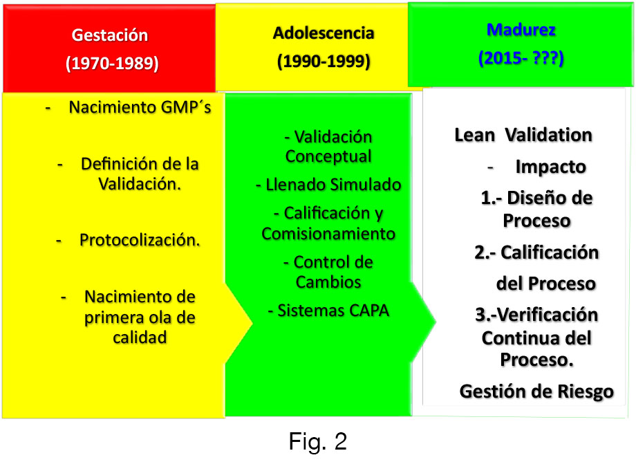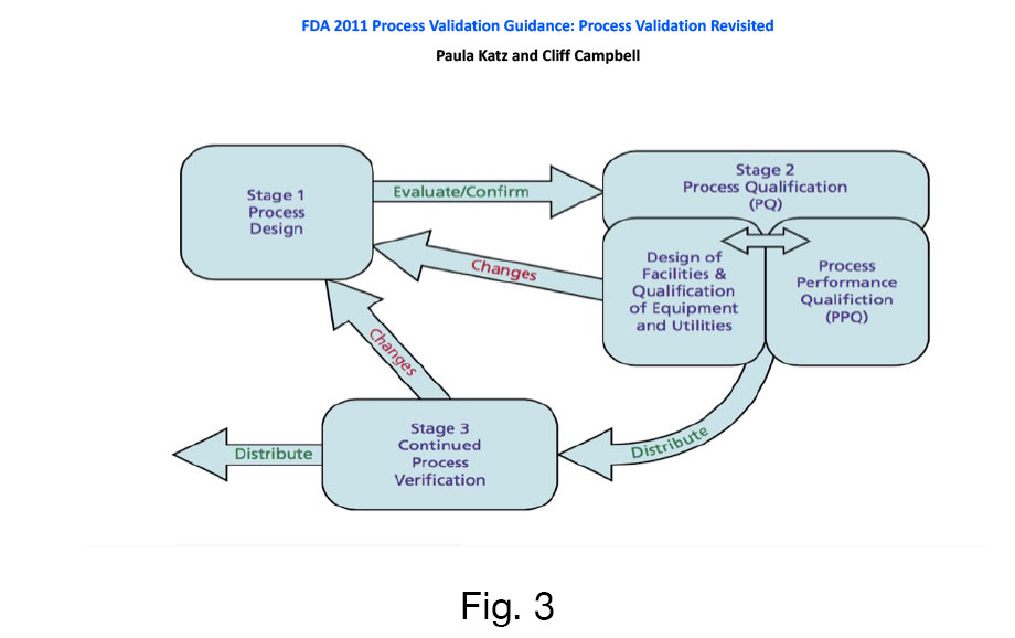 Con base en la evolución de la Validación de procesos (Fig. 2), tenemos un enfoque de la Validación llamado “Lean Validation”, cuyo mayor impacto lo tenemos en la aplicación de las tres etapas del Proceso de Validación, cuya referencia está publicada en el Guidance for Industry-Process Validation: General Principles and Practice inciso B. Approach to Process Validation. Stage 1 – Process Design, Stage 2 – Process Qualification y Stage – 3 Continued Process Verification (Fig. 3).