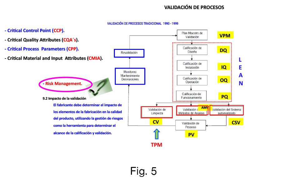 En las que será determinante en el estado 1 – Diseño del Proceso (NOM-059-SSA1-2015 inciso 9.9.2.1), definir los CMA, CPP, CCP, que afectaran los CQA´s del producto final, tanto para la Calificación de Equipos como para el proceso de validación (Fig. 4), proporcionando las metodologías necesarias para mejorar continuamente, mediante la verificación continua del proceso (Estado 3, inciso 9.9.2.3) y crear valor a sus clientes, demostrando el mantenimiento del Estado Validado en todo el ciclo de vida del producto, teniendo como principio fundamental la Gestión de Riesgos de Calidad (GRC) en cada una de las etapas de la Validación de Procesos, en las que incluiremos los conceptos de Lean en cada una de las etapas de Calificación, en la que será fundamental la aplicación de las metodologías que apliquen en cada fase para incrementar la productividad de los procesos validados en toda la cadena de valor (Fig. 5).