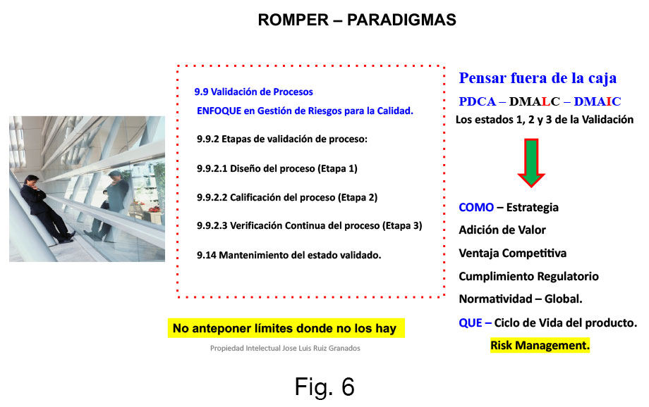 Para lograr estos beneficios es imprescindible romper paradigmas que hoy por hoy permanecen arraigados en el sector farmacéutico obstaculizando el proceso de mejora continua (PDCA) en los procesos validados, debemos pensar fuera de la caja para desarrollar las estrategias necesarias de productividad y plasmarlas específicamente en los protocolos de Validación, como desarrollaremos y aplicaremos estos modelos de DMALC y DMAIC dentro del PDCA, para ir más allá del cumplimiento regulatorio local y global, y generar ventaja competitiva a la organización a través de la validación de procesos, manteniéndolos altamente productivos, demostrando el mantenimiento del estado validado en todo el ciclo de vida del producto, todos bajo la sombrilla de la GRC (Fig. 6).