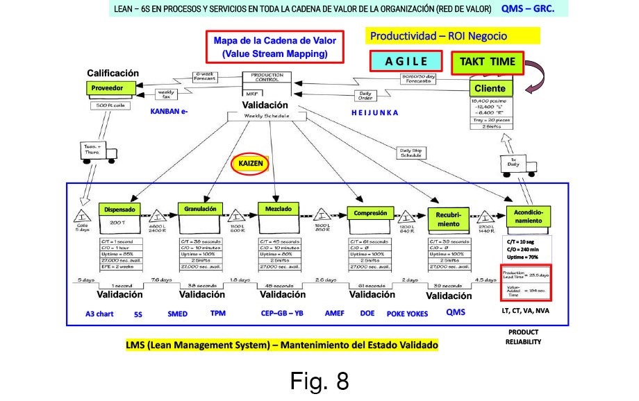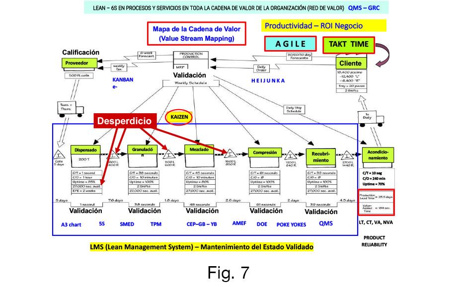 Por lo que debemos tener como punto de partida base el mapeo de valor (VSM) de cada uno de los procesos para entender el funcionamiento integral de la organización y evaluar el impacto en toda la cadena de valor, siendo necesario generar los diagramas de flujo de cada operación unitaria como parte integral del VSM, identificando los desperdicios a eliminar (Lean), de forma tal que disminuyamos a su mínima expresión las variaciones presentes en el proceso (Six Sigma) tanto en la calificación como en el proceso de validación, reflejados en la productividad del negocio (Fig. 7).