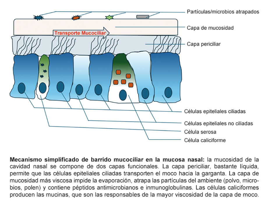 En general, una persona inspira y espira 20 mil veces al día. La mejor forma de inspirar es hacerlo por la nariz, ya que la cavidad nasal prepara el aire para que pase a las vías respiratorias inferiores. El aire inhalado se humedece, se calienta y se filtra. Las partículas de más de 15 µm quedan retenidas en las fosas nasales antes de llegar a las vías inferiores. La suciedad, el polen y las partículas aerosoles que pueden contener virus o bacterias quedan atrapadas e inmovilizadas en esta capa de mucosidad. El llamado mecanismo de depuración mucociliar transporta los contaminantes atrapados hacia la garganta para que sean tragados y salgan de las vías respiratorias. Para que la mucosa funcione correctamente, la capa epitelial debe estar intacta y cubierta por mucosidad bastante líquida. Esta capa de moco contiene también inmunoglobulina A (IG A), lisozima, lactoferrina y otras proteínas antimicrobianas activas que protegen contra los microbios. El sistema puede verse alterado por la resequedad de este revestimiento, por la producción excesiva de moco muy viscoso o simplemente por el exceso de lavado.