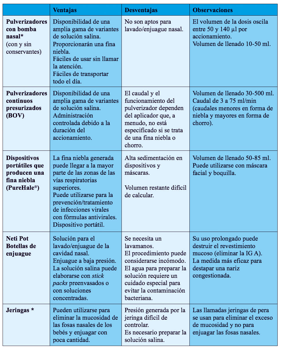 El uso de soluciones salinas debe adaptarse al estado de la cavidad nasal para lograr el mayor alivio de los síntomas y beneficios duraderos. Si la fosa nasal no está obstruida, el hecho de mantener o restablecer la depuración mucociliar brindará una sensación de comodidad y mantendrá los mecanismos de protección. La administración de cantidades pequeñas de solución salina garantiza la humidificación y no eliminará la capa de mucosidad que contiene la defensa eficaz antimicrobiana de la inmunoglobulina A. Es preferible utilizar formulaciones sin conservantes, ya que estos (por ejemplo, el cloruro de benzalconio) afectarían los mecanismos de depuración mucociliar (Rizzo JÂ, Medeiros D, Silva AR, Sarinho E. Benzalkonium Chloride and Nasal Mucociliary Clearance: A Randomized, Placebo-Controlled, Crossover, Double-Blind Trial. American Journal of Rhinology. 2006;20(3):243-247. doi:10.2500/ajr.2006.20.2867). Solo debe recurrirse al lavado de las fosas nasales con mucha solución salina si están obstruidas por una gran cantidad de mucosidad espesa.