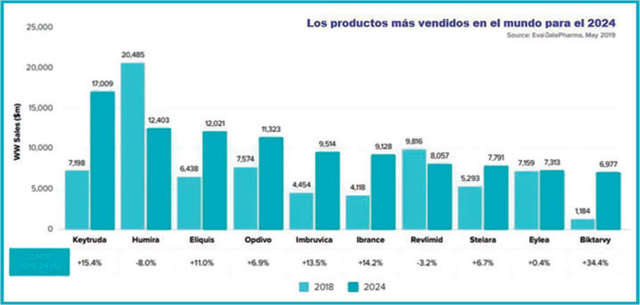 Keytruda le quitará el trono a Humira. Revlimid sale de los primeros tres lugares. El incremento en ventas de 1.5 mil millones en ventas para Humira le aseguró permanecer en los primeros lugares de ventas durante 2018. Sin embargo, debido al lanzamiento de varios productos biosimilares en Europa y Estados Unidos en 2023, en 2024 se espera una disminución en sus ventas. Esta reducción, aunada al fuerte año para Keytruda respecto a las ventas, los resultados positivos en los estudios clínicos y más aprobaciones de la FDA, le permitirán a Keytruda vencer a Humira y tomar el primer lugar en ventas para el pronóstico de 2024.