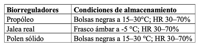 Previo al uso de las materias primas apícolas analizadas, se garantizó un almacenamiento correcto con el propósito de garantizar estabilidad de sus características físicas y microbiológicas originales. Las condiciones de almacenamiento para los biorreguladores apícolas se describen en la Tabla 1. Estudios recientes llevados a cabo en laboratorios Coaspharma, pusieron de manifiesto que las materias primas sólidas no son susceptibles a que sus atributos de calidad microbiológico, organolépticos y fisicoquímico se vean afectados, siempre que se garanticen condiciones idóneas de almacenamiento [5].