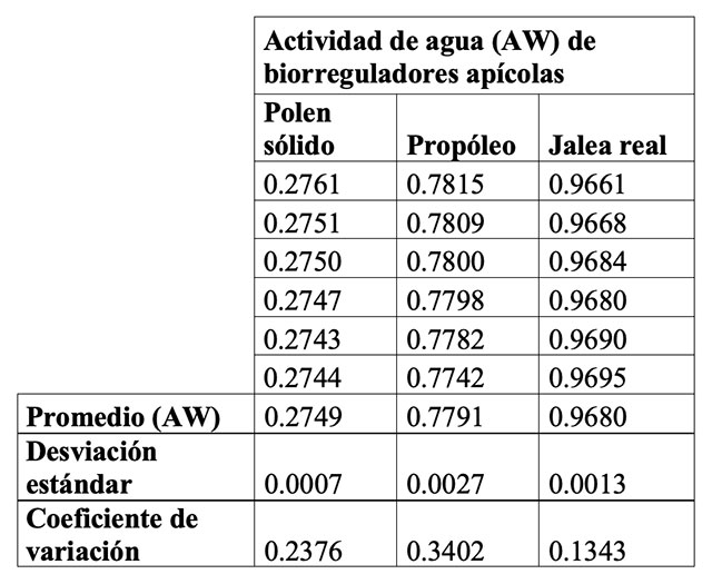 La implementación de métodos microbiológicos alternativos como la actividad del agua ha sido incentivada por la Farmacopea de los Estados Unidos y entidades reguladoras locales tales como el INVIMA (Instituto Nacional de Vigilancia de Medicamentos y Alimentos), gracias a que la actividad del agua puede usarse como un indicador de la carga microbiológica y estabilidad organoléptica de productos farmacéuticos sólidos no estériles tales como tabletas, cápsulas, pastillas y materias primas sólidas. Sin embargo, la implementación de la actividad de agua como un indicador microbiológico y organoléptico está completamente inexplorada en productos derivados apícolas destinados para el uso de nuevas formulaciones con fines terapéuticos y cosméticos. El objetivo principal de este estudio es cuantificar la actividad de agua de biorreguladores apícolas tales como el propóleo, jalea real y polen, con el fin de determinar si la actividad de agua se puede utilizar como un indicador de calidad microbiológico en productos biológicos destinados a ser utilizados como principios activos de productos de cuidado personal, suplementos dietarios y farmacéuticos.