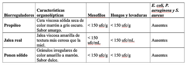 A los biorreguladores apícolas analizados pólenes, jalea real y propóleo, se les realizaron pruebas microbiológicas y organolépticas “aspecto, color y olor”. Para los análisis microbiológicos se realizaron análisis de mesófilos, hongos y levaduras, usando los métodos convencionales como la siembra directa en placas. Las pruebas microbiológicas y organolépticas se llevaron a cabo en paralelo y en simultáneo con la cuantificación de la actividad de agua.