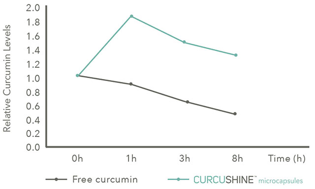 La biodisponibilidad de CURCUSHINE™ microcapsules es significativamente más alta que el control permaneciendo hasta 8 horas después de la toma.
