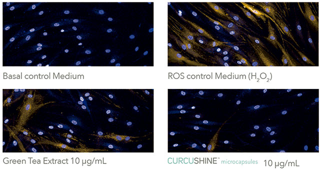 La determinación de los niveles de las Especies Reactivas de Oxígeno (ROS) es un buen indicador del estrés oxidativo y para evaluar las propiedades antioxidantes en células vivas. Después de inducir un estrés oxidativo con peróxido de hidrógeno en Fibroblastos Dérmicos Humanos (HDFa), se evaluó el efecto antioxidante de CURCUSHINE™ microcapsules y se comparó con el Extracto de Té Verde midiendo la inhibición de la acumulación de ROS.