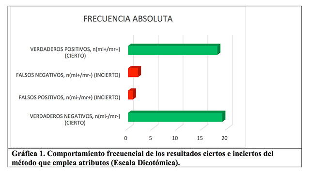 Para el caso de resultados inciertos, a los primeros les denominan falsos positivos y a los segundos falsos negativos, que en conjunto representan la “INCERTIDUMBRE DEL MÉTODO QUE EMPLEA EL INSTRUMENTO”. Para obtener esta medida, la debemos reportar en términos de probabilidad; aunque para fines de calidad, la incertidumbre de mayor impacto son los falsos positivos, ya que por ejemplo, una materia prima que no cumple con la identidad, que es liberada en dicha prueba, será utilizada en un proceso de fabricación; mientras que en el otro caso, los falsos negativos, una materia prima que si cumple con la identidad, el método la reporta como ‘NO CUMPLE’ y, por lo tanto, no es utilizada en un proceso de fabricación, o en otras palabras es rechazada con la consecuente pérdida de tiempo y recursos. Se recomienda para estos casos reportar la incertidumbre en términos frecuenciales, lo que puede ser visualizado en la gráfica uno.