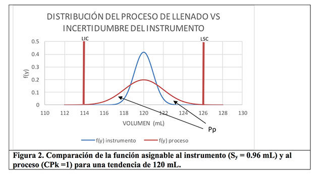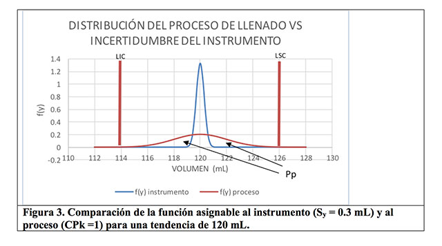 Y bajo un valor de Sy = 0.3 mL, se genera la figura 3, cuyo valor de Pp = 0.72, que en términos frecuenciales se interpreta que, por cada 100 volúmenes de llenado, 72 de ellos pueden asignarse a la variabilidad del proceso y 28 serán explicados por la incertidumbre del instrumento; es decir, se dará un mayor margen a la variabilidad asignable al proceso.