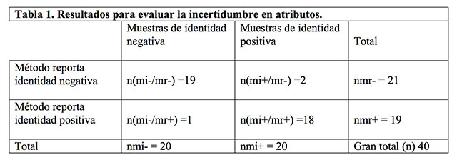 Cuando se miden atributos como es el caso de una escala de dos categorías en una prueba de identidad (CUMPLE, NO CUMPLE), para estimar la idoneidad se evalúan 20 pruebas de identidad positiva y 20 pruebas de identidad negativa. Al menos 20 permite para manejar una confiabilidad del 95% o un error de tipo I a=0.05 cuyo inverso es 20. A éstas se les aplica el método que utiliza dicho instrumento de medición, lo que genera la siguiente matriz 2x2: