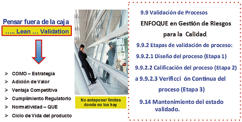 Por lo que, con estas armonizaciones internacionales FDA – EMA – OMS – NOM-059-SSA1-2015, serie ISO, principalmente, necesitamos cambiar la forma de pensamiento, romper paradigmas, pensar fuera de la caja, si todos los caminos nos llevan a Roma, esto indica que todo nos lleva al concepto Lean Validation, el mantenimiento del estado validado en los tres lotes de validación en todo el ciclo de vida del producto de los lotes comerciales, y correlacionarlo a la estrategia de control a desarrollar e implementar en el proceso de validación. (fig. 4 y 5).