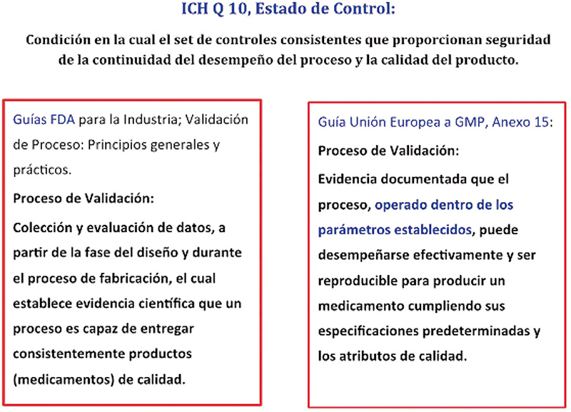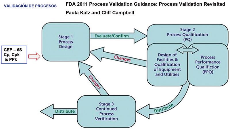 Analizando detenidamente esta comparativa entre FDA y Unión Europea (fig.6), es interesante ver el proceso de mejora, mientras la 1ra se enfoca en implementar, probar y comprobar durante el proceso de manufactura, mediante la colección y evaluación de datos, partiendo de la etapa 1 (diseño), que un proceso es capaz de entregar cumpliendo con la calidad requerida, por otro lado tenemos que, desde la perspectiva de la Unión Europea, anexo 15, se enfoca en documentar que el desempeño del proceso de manufactura ha sido operado dentro de los parámetros establecidos, desempeñándose de una manera efectiva, monitoreando los atributos críticos de calidad del producto, así como realizando la medición y el análisis estadístico de los parámetros críticos de procesos y los atributos críticos de calidad identificados en la estrategia de control (estado 2).