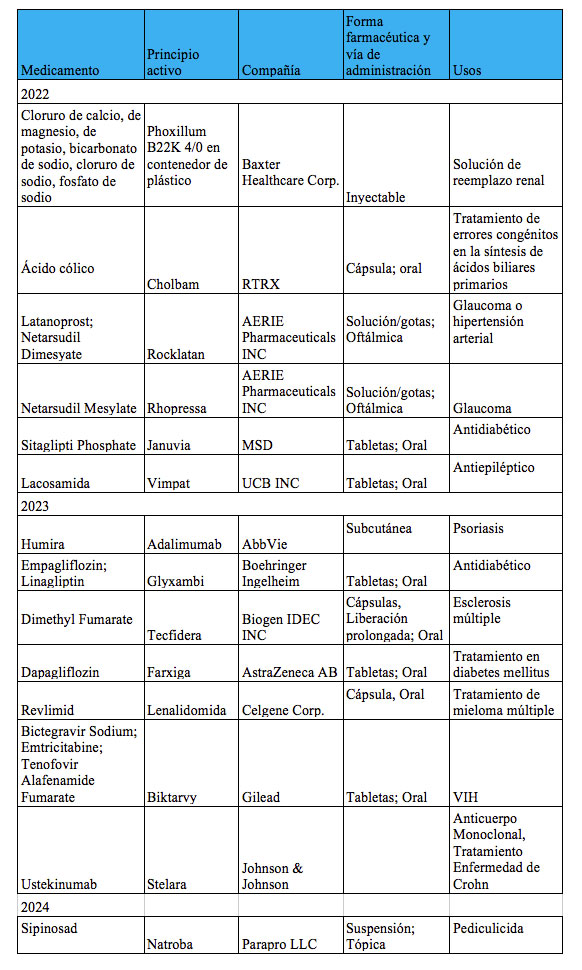 Dentro de los medicamentos que se encuentran en el “Libro Naranja” (Orange Book) de la FDA cuya patente está próxima a vencer tenemos los enlistados a continuación.