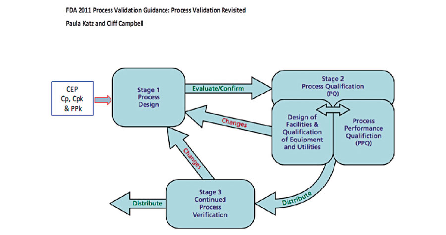 Por consiguiente, debe formar parte de las actividades diarias de los operadores dentro del proceso operativo, ya que es en donde nace la calidad de los productos y servicios, y con base la Nom-059-SSA1-2015 en su sección 9.1 Generalidades “La validación de procesos no es un evento puntual en el tiempo, sino que involucra un enfoque relacionado al ciclo de vida del producto, el cual debe considerar que la variabilidad es una característica intrínseca de los procesos de fabricación; conocer esta variabilidad, controlarla y analizar el impacto en la calidad, seguridad y eficacia de los medicamentos debe conducir a los procesos de mejora continua” (Fig.5).