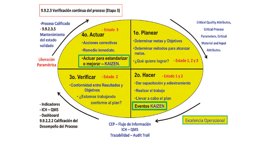En la que el cumplimiento de las tres etapas de la validación de los procesos, demostrando el mantenimiento del estado validado en todo el ciclo de vida y con base en la verificación continua del proceso en la etapa 3 (incisos 9.9.2.3 y 9.9.2.3.4), esta mejora de procesos, en la práctica, los hemos estado realizando a través de eventos Kaizen (Fig. 6).