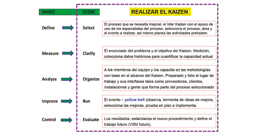Una vez seleccionado el proceso a mejorar y manteniendo el estado validado, se aplica la metodología DMAIC relacionada al SCORE en Kaizen, se realiza el evento Kaizen (Fig. 7), utilizando y completando los formatos establecidos en el SCORE, así como aplicando la metodología Yellow Belt para solución de problemas.