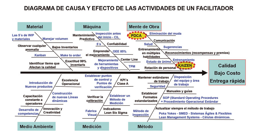 Convirtiéndose en un proceso continuo que no tendrá fin, en línea con el cumplimiento Normativo NOM-059-SSA1-2015 y normas internacionales, generando la ventaja competitiva que toda empresa o laboratorio requiere para llegar a ser líder del sector, en la que, entre otros trabajos a realizar, el supervisor, ahora facilitador de conocimiento, deberá estar en cumplimiento de las acciones llevadas a efecto en los Kaizen y el nuevo sistema de trabajo, alineando sus actividades en función del diagrama de Ishikawa para prevenir potenciales fallas, esto es CAUSA – EFECTO, y mantener los beneficios de los eventos Kaizen, que entre otros, están bajos costos de operación, máxima calidad y entrega rápida, sistemas ágiles en cumplimiento normativo con apoyo de la Tecnología DATA 4.0 y dispositivos electrónicos en las máquinas y líneas de acondicionado que migran la información a pantallas digitales de forma tal que se actúe de manera inmediata (Fig. 9).