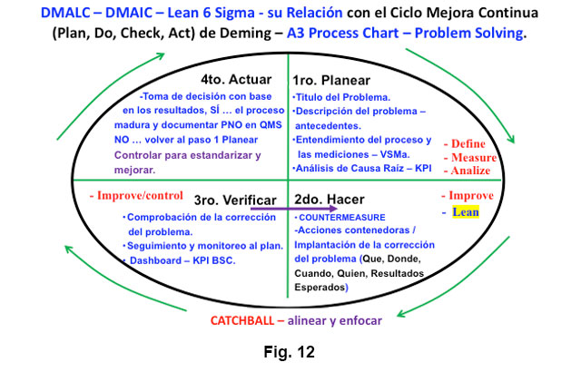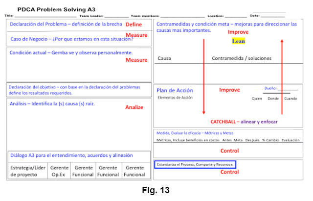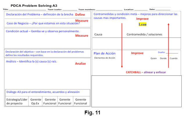 En la sección del Plan de Acción (Fig 11), que está alineado al Do – Check en el ciclo PDCA (verificar), se presentan escenarios muy importantes y críticos, ya que hay un flujo de información como resultado de las tareas especificadas en el plan de acción y que nos llevarán a evaluar los avances conforme al plan establecido. A este proceso se le conoce como “CATCHBALL” y ayuda a alinear la visión de la Alta Dirección, así como la gerencial en las actividades que se están realizando en el lugar de trabajo, cuantificando el desempeño del proceso con los KPI´s con la información y datos resultantes, que demuestren la solución del problema, así como el desempeño de los dispositivos Poka Yokes instalados en los modos de falla y evitar recurrencia evaluando alternativas que resulten durante el desarrollo de planes para cambios pilotos y cuantificación de costos asociados con las soluciones propuestas. Aprender de los problemas resueltos, midiendo los efectos para eliminar la fuente de los problemas, o si el tópico establecido (issue) está bien direccionado, comparando resultados vs. objetivos establecidos. En otras palabras, ¿estamos trabajando conforme al plan?