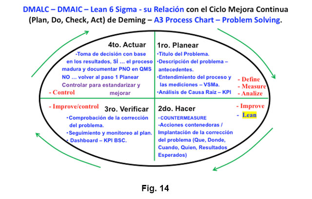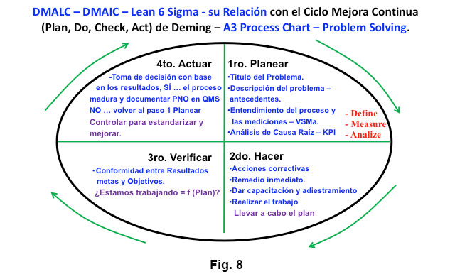 En esta sección, compartiré con ustedes una metodología he aplicado en consultorías para gestión de proyectos y solución de problemas de manera práctica. De forma tal que nos apoye en el involucramiento de todos los que intervienen en el proceso a mejorar o a solucionar un problema que evita que el proceso tenga un desempeño nivel 6 sigma, por lo que ahora abordaremos el A3 process charte para la solución de problemas (Fig.1) y lo enriqueceremos asociando cada una de sus fases con los conceptos y aplicación de Lean (DMALC) y Seis Sigma (DMAIC), fortaleciéndolo con el modelo de Deming, conocido como ciclo de la mejora continua. También se especificará en qué etapas de esta metodología se deberán aplicar los Análisis de riesgos, así como el sometimiento, de ser necesario, al proceso de Control de cambios, los que se estarán analizando por parte del buen amigo Hugo Téllez.