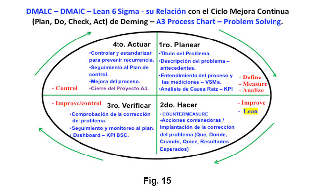 Analicemos el segundo escenario. No se alcanzaron los objetivos establecidos en el proyecto A3, se procede a cerrar el proyecto A3, se hacen los ajustes necesarios resultado del aprendizaje del no éxito y se vuelve a plantear bajo otras circunstancias el proyecto A3 con base en el ciclo de mejora o PDCA (Fig. 15).
