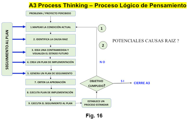 La carta de Proceso A3 es una metodología para solución de problemas con base en el método científico, por lo que para llevarlo a efecto es necesario tener un proceso lógico de pensamiento disciplinado, para mantener orden en la aplicación de cada etapa (Fig. 16).