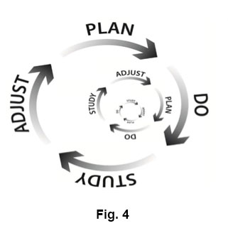 Como el proyecto es para realizar una mejora a un proceso establecido, se debe ver el proyecto como un todo en el que debemos diferenciar cada una de las etapas del ciclo de la mejora continua e integrarlo al A3 process chart (Fig. 3). Con esta visión sistémica podemos realizar y ejecutar cada una de las actividades en un proceso de ejecución y estudio de los resultados de cada una las tácticas aplicadas y hacer modificaciones, pero sin cambiar el plan establecido y continuar profundizando en el proceso (Fig. 4).