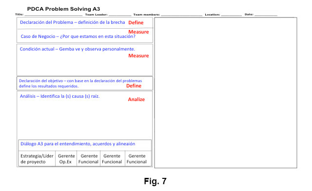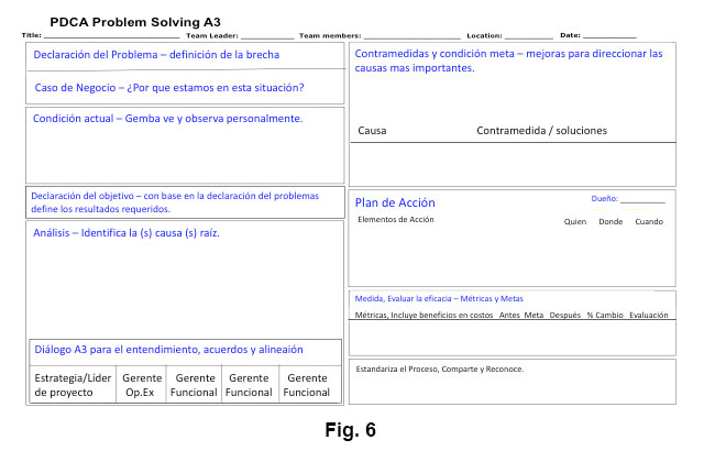 Una vez integrado el ciclo de la mejora continua de Deming en la carta de Proceso A3, en la fase de PLAN (Fig. 5), se reconoce que se tiene un problema el cual se redactará en la sección de declaración del problema. Se identifica y aterriza la estrategia en tácticas para ejecutarlas en piso, en la línea de producción o en el gemba, el lugar donde suceden los acontecimientos, de forma que sea visible a todos los operadores quienes serán los que ejecuten las tácticas (Fig. 6). Brevemente lo podemos describir como: