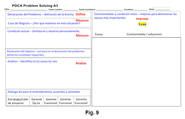 En el lado derecho de la carta de proceso A3 (Fig. 9), tenemos las contramedidas y la condición meta, equivalente al Do (en el PDCA), en las que se toman medidas de contención para que el problema no sea más crítico y se mantenga bajo control, aplicando las soluciones resultantes del análisis de causa(s) raíz y correr un experimento para probar la hipótesis de trabajo resultado del gap análisis (Fig.10).