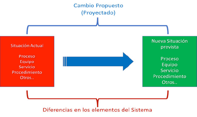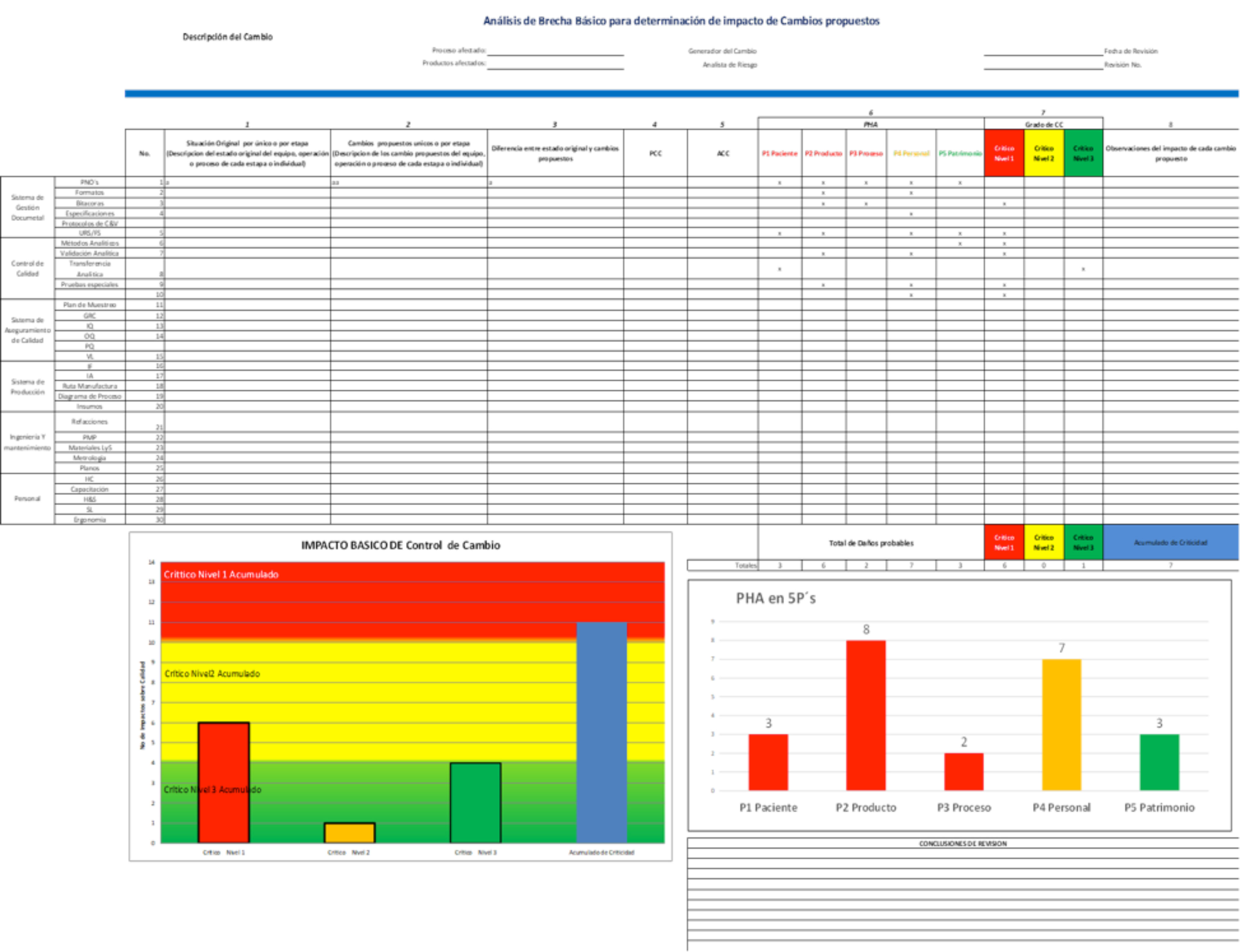 Basándose en esta tipificación de cambios, la evaluación de impactos necesaria podría ser filtrada a través de realizar las siguientes acciones, primero tener una descripción clara y detalla de la propuesta de cambio por cada elemento del sistema de calidad impactado (sistema documental, procedimientos, equipos, áreas, etc.), comparar los cambios en cada elemento contra la situación actual a ser modificada y realizar un análisis de brecha indicando las diferencias entre cada estado, con esta base estimar el impacto en las 5P´s mencionadas y por medio de una tabla de prorrateo valorar el grado de impacto para definir el nivel de criticidad de cada una de las actividades por elemento y totalizar todas y, con ello, establecer el nivel total de criticidad del cambio propuesto para definir las acciones ejecutivas para planificar la implementación del cambio propuesto con sus evidencias técnicas y el cronograma de seguimiento en la figura #1 (al final de este artículo) se presenta la hoja de cálculo para efectuar este análisis de riesgo y tenerlo como base de documentación para el cumplimiento establecido en la norma.