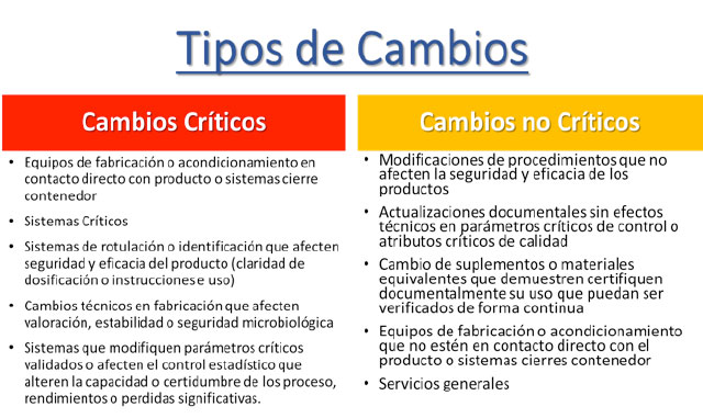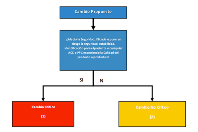 Considerando de forma específica cómo afecta el cambio propuesto la seguridad de uso, la calidad representada por los Atributos de Calidad (ACC), la estabilidad del producto, cómo altera o modifica los Parámetros Críticos de Control, qué asegura el estado validado del proceso como medidas directas del cuidado de la calidad del producto, esta separación permitiría de forma sencilla clasificar los cambios en dos grupos, los críticos sí afecta lo mencionado y los no críticos.