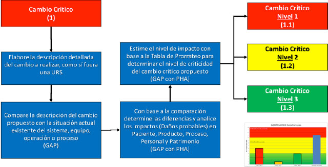 - El uso de una herramienta comprobada para la evaluación de los impactos del cambio y poder establecer las estrategias de control y administración de los riesgos detectados en los procesos, proveedores, sistemas críticos, sistemas computacionales, áreas, servicios, equipos, métodos analíticos, especificaciones, documentación, disposiciones regulatorias y calidad del producto.