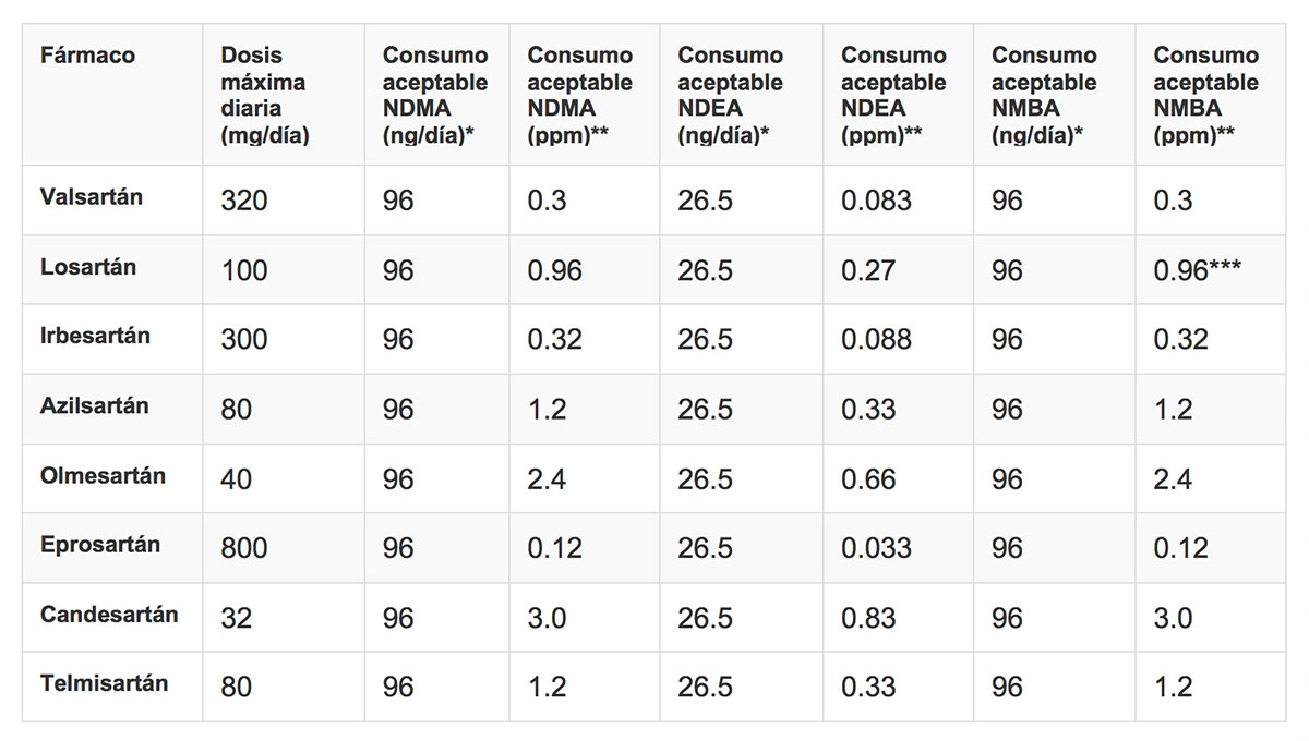 En febrero del 2019, la EMA publicó los límites temporales de la cantidad de NDEA y NDMA encontrados en estos medicamentos. Después de un periodo de transición, las empresas tendrán que demostrar que sus productos no contienen impurezas cuantificables de NDEA y NDMA antes de poder comercializarlos. La FDA también publicó los límites de estas sustancias.