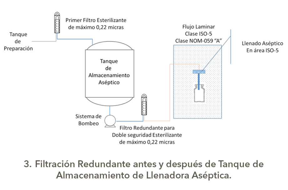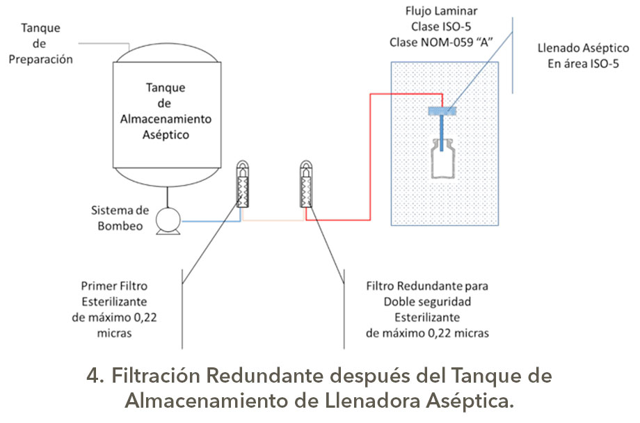EL informe técnico publicado por la Parenteral Drug Association (PDA) proporciona cierta claridad. El informe define la filtración redundante como "un tipo de filtración en serie en el que un segundo filtro de esterilización se utiliza como respaldo en caso de un fallo de integridad del filtro de esterilización primaria"(2). El segundo filtro de esterilización está incorporado en línea, usualmente antes del tanque de almacenamiento o posiblemente después de éste, para proporcionar seguridad adicional de filtración esterilizante, dice Jerry Martin, vicepresidente senior de asuntos científicos mundiales de Pall Life Sciences, uno de los autores del Reporte Técnico de la PDA en esa época y una gran persona y profesional que hoy está retirado y es un excelente asesor.
