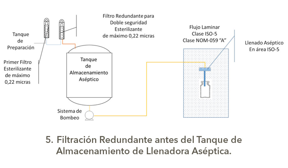 Pero en la práctica, los registros actuales de productos estériles por procesamiento aséptico fueron otorgados sin filtración redundante o varios de ellos, así como los estudios de estabilidad fueron realizados para lotes fabricados en su mayoría sin ésta y no se consideró la probable adsorción de activos o el efecto de los lechables o lixiviables (correctamente dicho) en una doble filtración, esto es importante para un sistema legado en México con esta realidad.