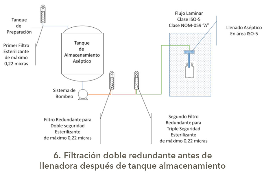 Teniendo esta base, es obvio asegurar que por medio de un doble filtro se mitigará el riesgo de contaminación microbiológica del afluente, pero no se si desde el punto de vista redundante o normativo es válido aprobar un lote con esa condición en México, como si pensáramos, como en los caminos de 18 ruedas, si pones en un rin dos ruedas y se poncha la primera tienes otra en el rin, eso es redundancia y continuidad de funcionalidad.