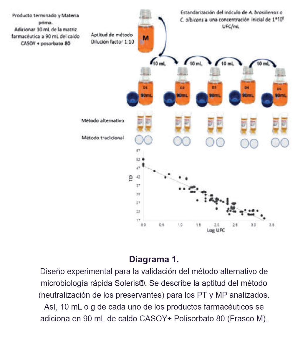 En estudios preliminares llevados a cabo en el laboratorio de microbiología de Coaspharma S.A.S. se validó el método alternativo de microbiología rápida basado en el crecimiento automatizado para la detección de hongos y levaduras utilizando como matriz farmacéutica una suspensión oral antiácida (1). En esta validación se demostraron todos los criterios exigidos por la USP vigente capítulo 1223 para validar un método alternativo cuantitativo (1,2,3). Estudios semejantes también realizados en nuestro laboratorio pusieron de manifiesto la eficacia de esta metodología para cuantificar hongos y levaduras a partir de productos de cuidado personal, a su vez, se demostró su eficacia para detectar bacterias formadoras de biopelículas en los sistemas de distribución de agua tales como el complejo Burkholderia cepacia (2,3). Por tanto, el presente trabajo es una extensión de las tres publicaciones previamente descritas para demostrar el amplio espectro de productos que se pueden analizar por esta metodología alternativa.