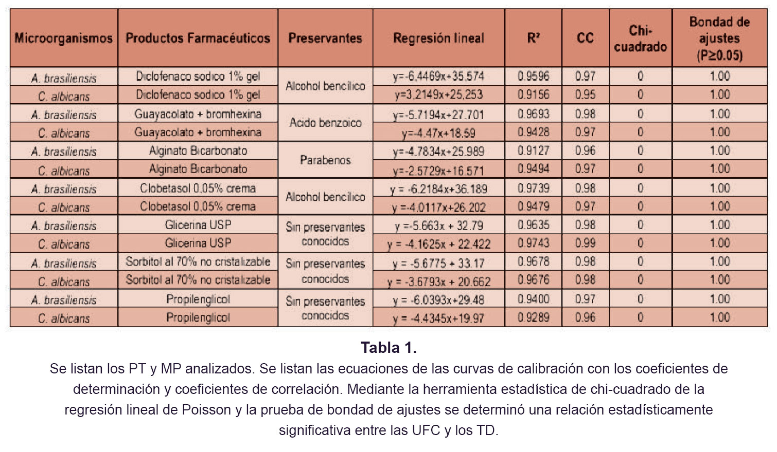 Se realizó la supresión de la actividad antimicrobiana para todos los PT y MP analizados, y posteriormente se realizó la recuperación de C. albicans y A. brasiliensis en forma paralela y simultánea mediante el MTCP y MMA. Para evaluar la aptitud del método para cada uno de los PT y MP analizados, se utilizó polisorbato (Tween® 80), un compuesto altamente etoxilado, para neutralizar químicamente la actividad de los preservantes farmacéuticos. Todos los productos analizados por microbiológica rápida Soleris® fueron previamente validados por el método tradicional de conteo en placa, garantizando que para los PT y MP analizados se podría llevar a cabo de manera eficiente la supresión de los preservantes o compuestos con actividad antimicrobiana (ver Tabla 1). Esta recuperación de microrganismos en paralelo y en simultaneo permitió la construcción de las curvas de correlación (TD vs Log UFC).