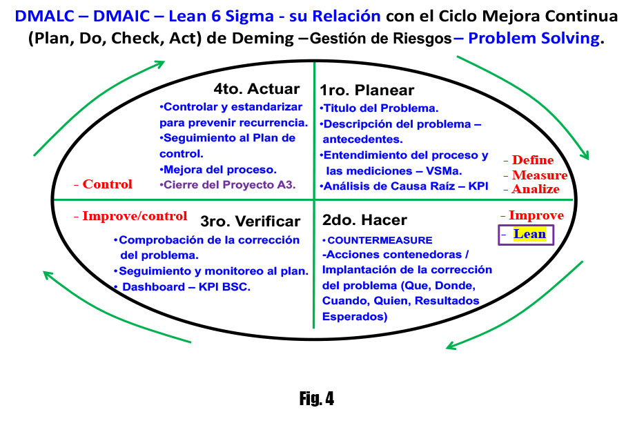 Por lo que, una vez realizado este análisis, tendríamos la propuesta de mejora continua utilizando el modelo PDCA integrando la Gestión de Riesgos con base en el proceso de pensamiento Lean Six Sigma y el pensamiento crítico (Fig. 4).