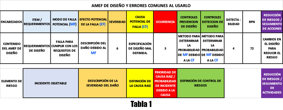 Una de las metodologías que más se utiliza para el análisis de riesgo es el AMEF (Análisis Modal del Efecto y Falla), por lo que es de vital importancia comenzar por un buen diseño, pero normalmente cometemos errores, siendo los más comunes en esta fase los resumidos en la Tabla 1: