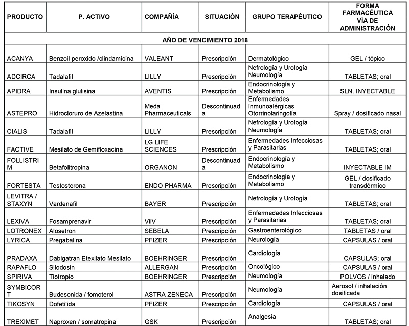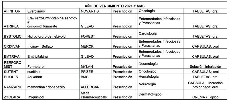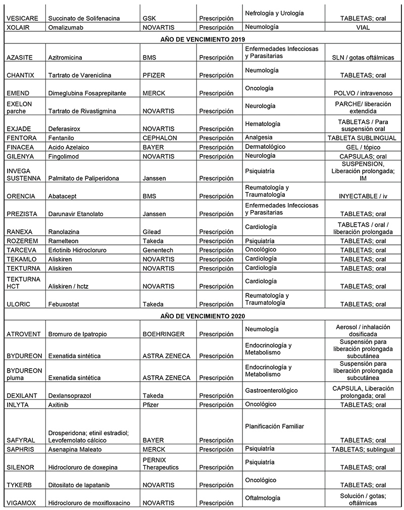 Además, hay algunos medicamentos huérfanos cuya patente está por vencer. Entre ellos se encuentran los siguientes: