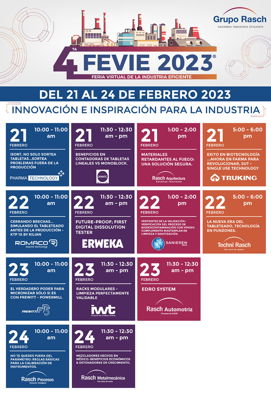 FEVIE es un evento super flexible y dinámico realizado en conjunto con las empresas representadas de Grupo Rasch®️ que trae para tí conocimiento especializado, además de entablar conversaciones que ayudan a resolver inquietudes sobre tus procesos actuales.