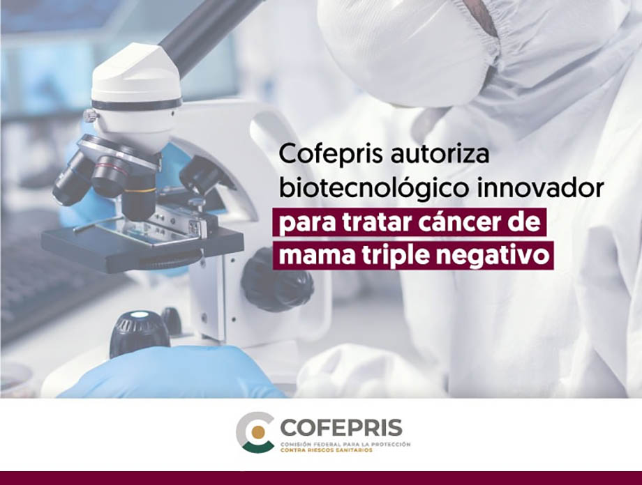 Comunicado. La Cofepris dio a conocer que aprobó el registro sanitario de sacituzumab govitecán, medicamento biotecnológico innovador destinado al tratamiento de cáncer de mama triple negativo, en etapas localmente avanzadas o metastásicas.