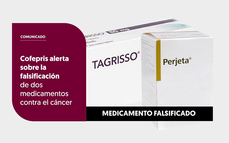 Comunicado. La Cofepris emitió una alerta sobre la falsificación y comercialización irregular de dos medicamentos empleados en el tratamiento de tipos específicos de cáncer: Perjeta (pertuzumab) solución 420 mg/ 14 mL (30mg/mL) y Tagrisso (osimertinib) 80 mg.
