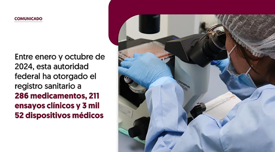 Comunicado. En los últimos 10 meses, la Cofepris autorizó 3,549 nuevos insumos para la salud en México. Entre enero y octubre de 2024, esta autoridad federal ha otorgado el registro sanitario a 286 medicamentos, 211 ensayos clínicos y 3,052 dispositivos médicos bajo el más alto rigor técnico y científico.