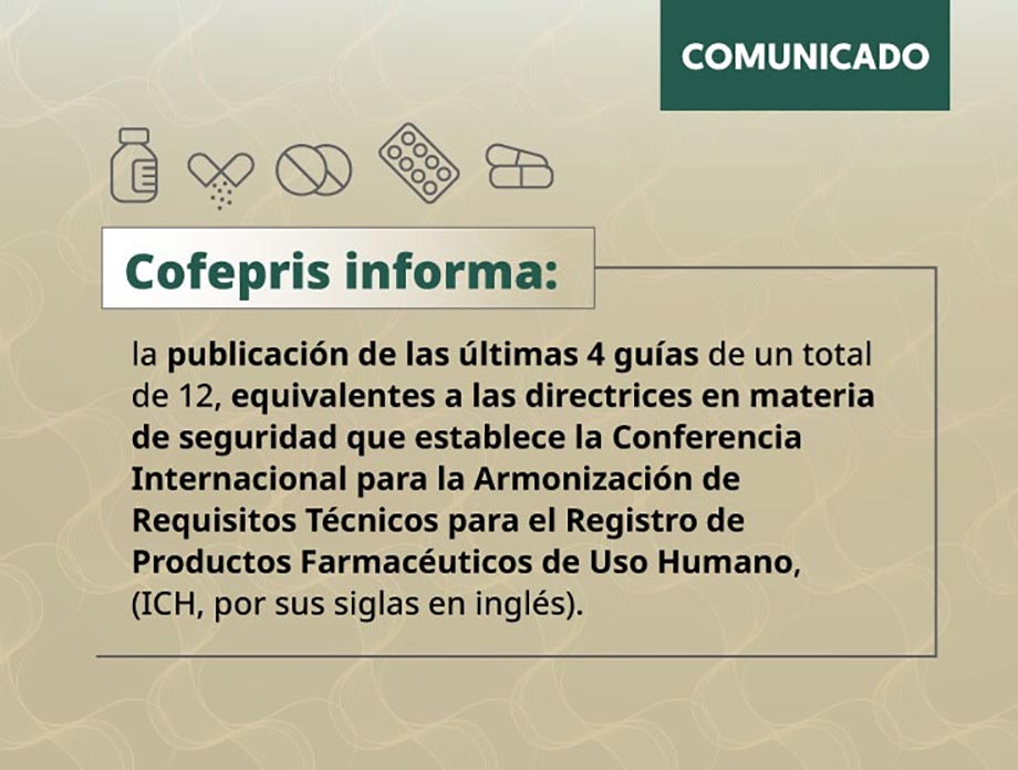 Comunicado. La Cofepris presentó las últimas cuatro guías equivalentes a las directrices de seguridad que establece la Conferencia Internacional para la armonización de requisitos técnicos para el registro de productos farmacéuticos de uso humano (ICH, por sus siglas en inglés), que tiene como objetivo establecer requisitos regulatorios armonizados y así contribuir en el acceso de medicamentos en todo el mundo.