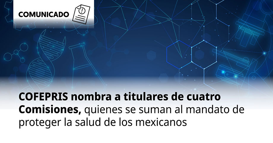 Comunicado. La Cofepris dio a conocer los nombramientos de los titulares de cuatro comisiones, quienes bajo el liderazgo de la comisionada federal, Armida Zúñiga Estrada, refrendan su compromiso de proteger la salud de la población mexicana, a través de una regulación sanitaria ágil, eficiente y transparente, con estricto apego a la ciencia, la ética y con un enfoque humanista.