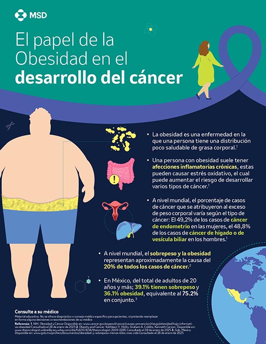 La obesidad, definida como la acumulación excesiva de grasa corporal, no sólo contribuye a la inflamación crónica, sino que también altera los niveles hormonales, como la insulina y el estrógeno, lo cual incrementa la probabilidad de desarrollar hasta 13 tipos diferentes de cáncer. Entre los más comunes se incluyen los de esófago, mama, colon y recto, útero, vesícula biliar, estómago, riñones, hígado, ovarios, páncreas, tiroides y cerebral.
