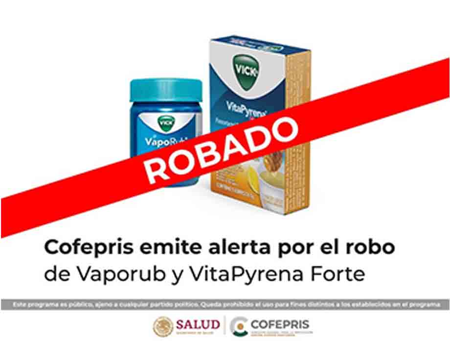 Comunicado. La Cofepris alertó sobre el robo de medicamentos Vaporub y VitaPyrena Forte a la empresa Procter & Gamble Manufacturing México, durante el traslado de los productos.